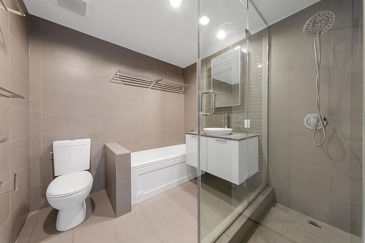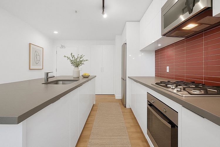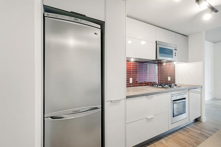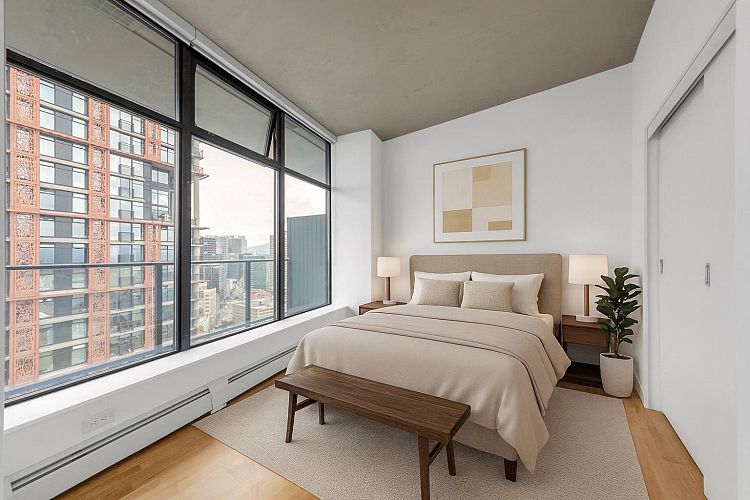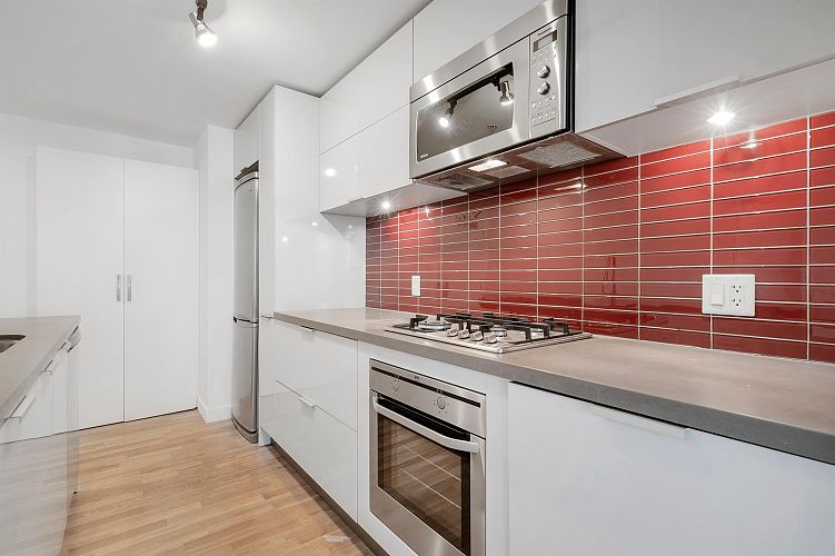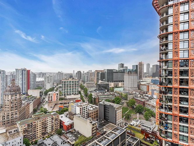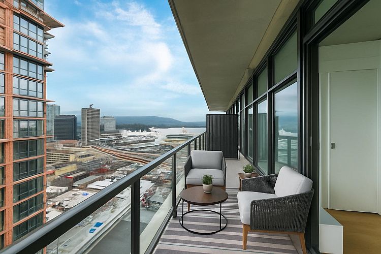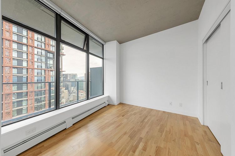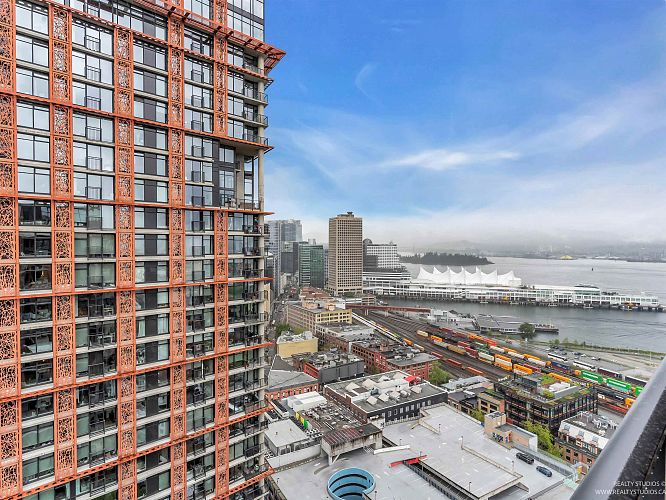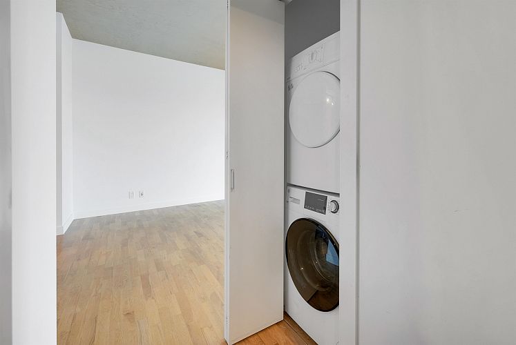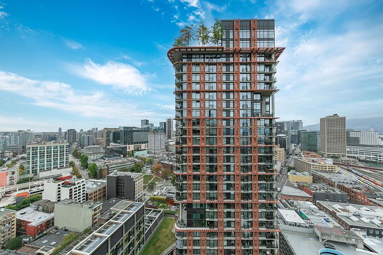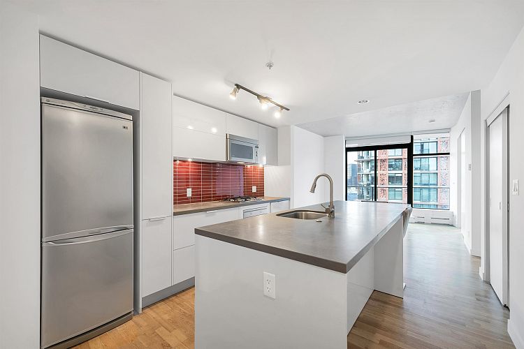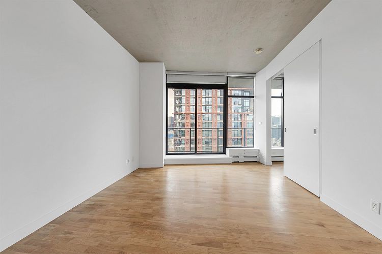 TOP FLOOR of the historic Woodwards! Sweeping views of City skyline, Ocean and North Shore mountains to enjoy from your patio that extends the length of the suite. Freshly painted and ready for a new owner, this urban condo offers over height polished concrete ceilings, giant floor to ceiling windows in the living and bedroom, h/w flooring throughout and enviable counter space that include a large quartz topped island. Large bathroom with separate shower and soaker tub, insuite laundry and California closets in the bedroom. Woodward's is famous for it's amenities and W shaped rooftop hot tub. Top of the line fitness centre, party room and working stations in a common area for work from home folks who like a change of scenery.