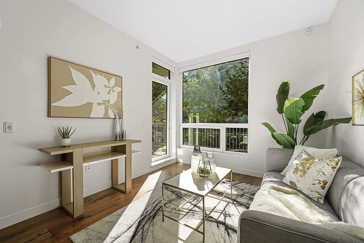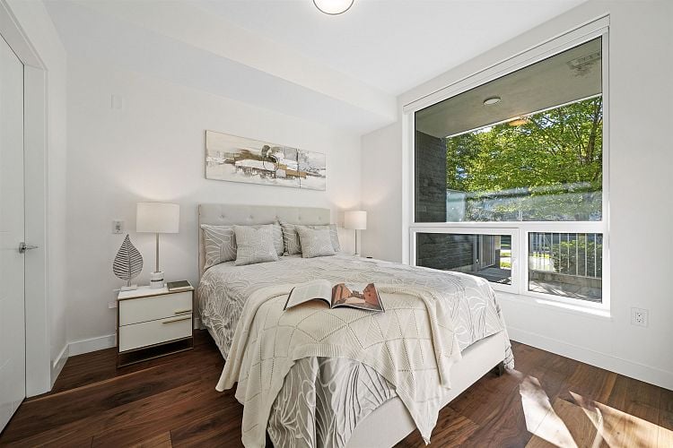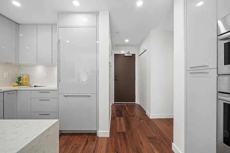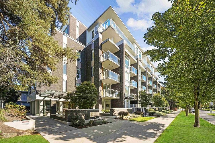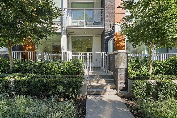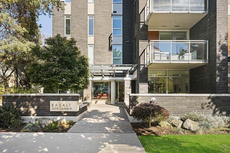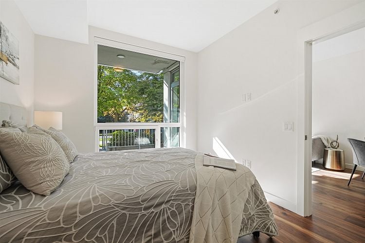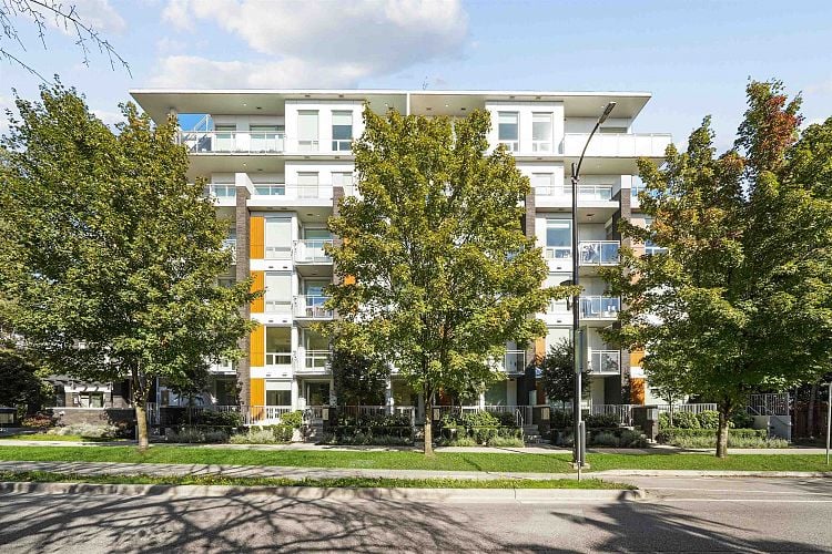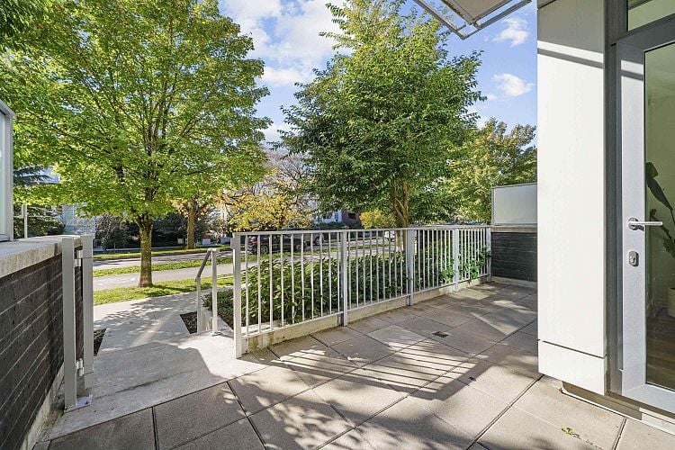 Welcome to this bright ground-level suite with private direct access that provides a townhouse feel. This 1 Bed + Den has a LARGE West-Facing PATIO. Open layout with 9' ceilings, sleek kitchen equipped with full-size integrated Bosch appliances, SS wall-oven, ample cabinet, counter space, premium walnut HW flooring throughout. The bathroom features Nuheat in-floor heating, with porcelain tiles seamlessly wrapping the floors and walls. Boutique CONCRETE building situated along the Cambie Corridor - prime WestSide Location. Enjoy having Queen Elizabeth Park as your backyard with easy access to Canada Line Skytrain Station, Oakridge Mall, Richmond, Airport or DT. Includes 1 PARKING + 1 LOCKER