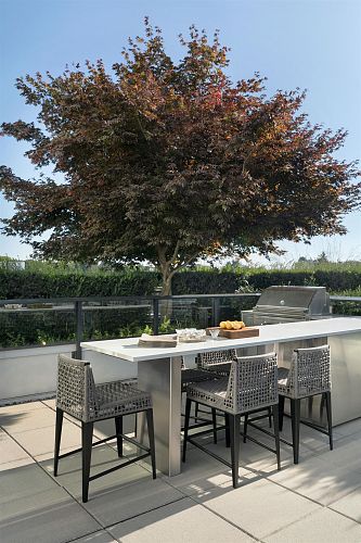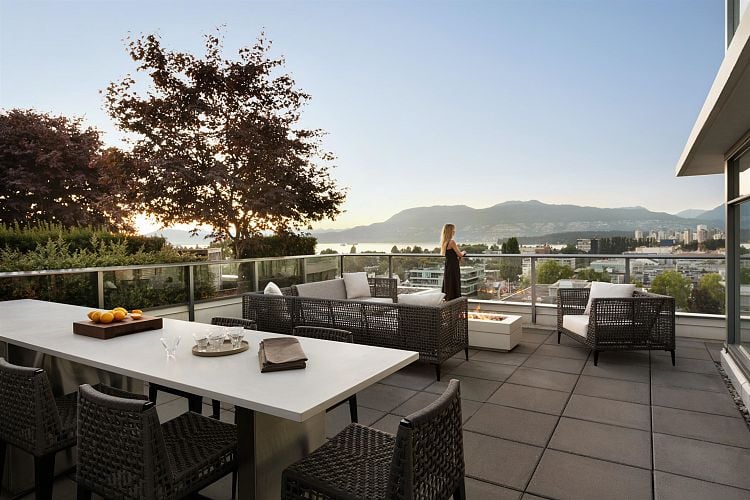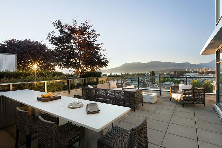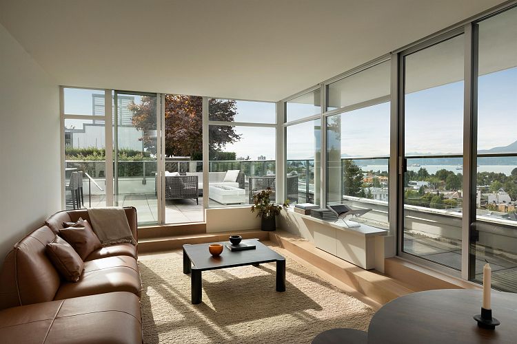 A View From the Top — terrace penthouse by untitled design agency crowns Kits360 with a zen-inspired terrace framing cinematic views of ocean, city, and mountains. Reimagined from the studs up, the home is a study in light, proportion, and detail — featuring a neutral palette consisting of natural materials, custom-built cabinetry, motorized blinds, and subtle architectural reveals that blend seamlessly into the design. Inside and out, spaces flow effortlessly — from open living areas to the built-in outdoor kitchen, lounge, and dining, all enveloped by curated greenery. A place where time slows, hearts skip a beat, and design finds its calm. Includes parking, storage, concierge, and fitness studio. Steps from West 4th shops, Kits Beach, and Vancouver’s finest cafés and restaurants.