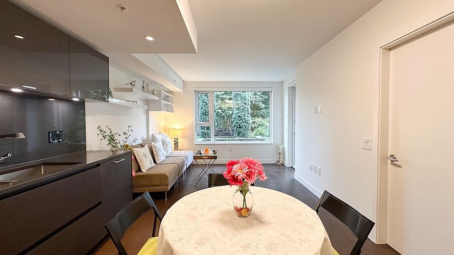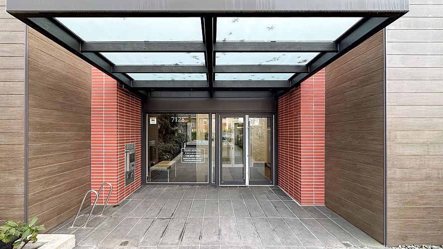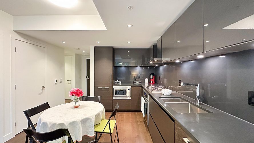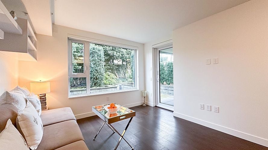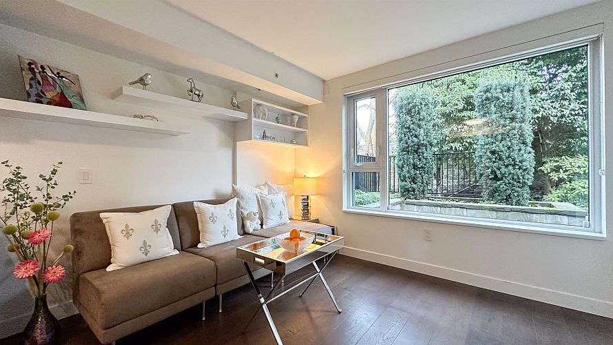 Hudson House at Shannon Wall Centre. Quality concrete low rise building on 10 acres land. 1 bed + den with hardwood flooring, air-conditioning, radiant heat, high end European appliances, gas stove, stone countertop. Huge over 300SF patio with privacy. Bonus EV Charger Ready parking. Amenities included heated outdoor lap pool, fully equipped gym, rooftop BBQ area, kids play ground and a beautiful park for relax. School catchment - Maple Grove Elementary, Magee Secondary and UBC. Close to 6 famous Golf Courses, Arbutus Club and Kerrisdale Village. 15 minutes drive to downtown, Richmond Airport, Burnaby and UBC. Easy to show by appointment. Side by side next unit also for sale, same size, same floor plan with balcony. Open House Sun March 8, 2-4pm