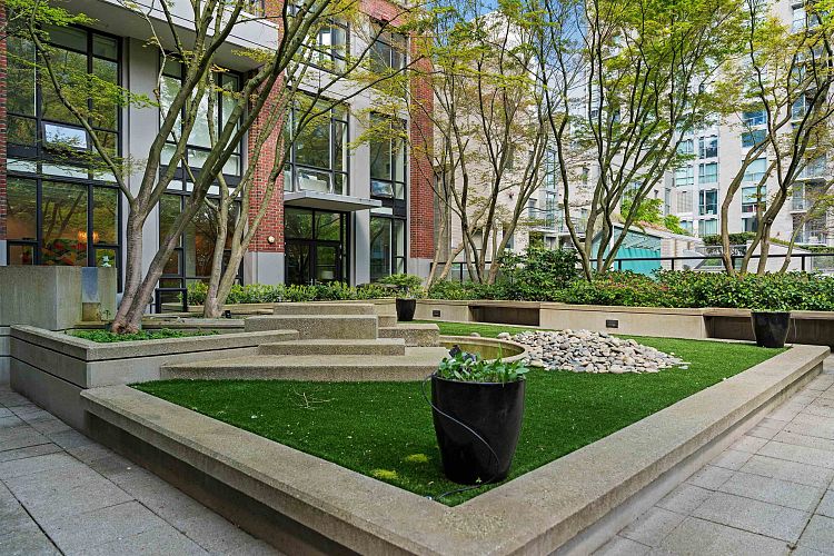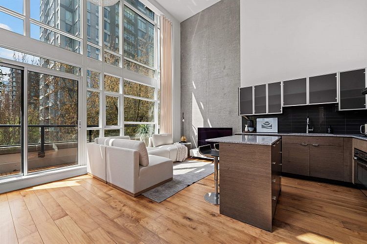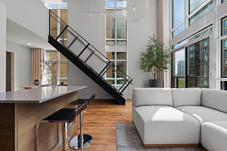 Welcome to ‘Tribeca Lofts’ rare corner 2-level Yaletown loft w/ tons of natural light. Truly one-of-a-kind! A functional 803 sq layout, this home features double-height 17’-3” ceilings, NEW blackout automated roller blinds, exposed concrete feature wall, floating steel staircase, & custom floor-to-ceiling draperies. Enjoy the bright main floor living room & kitchen (opening onto the full-width terrace), a spacious dining area, versatile den, powder room & a large entry closet w/ laundry. Upstairs you'll find the bedroom (w/ large window!) & ensuite bathroom featuring a large vanity, timeless tile & accent lighting. ‘Tribeca Lofts’ is a boutique New York-inspired loft building w/ a recently completed full exterior envelope refresh. Steps to Yaletown restaurants, shopping & transit.