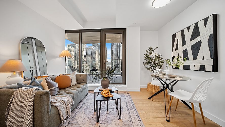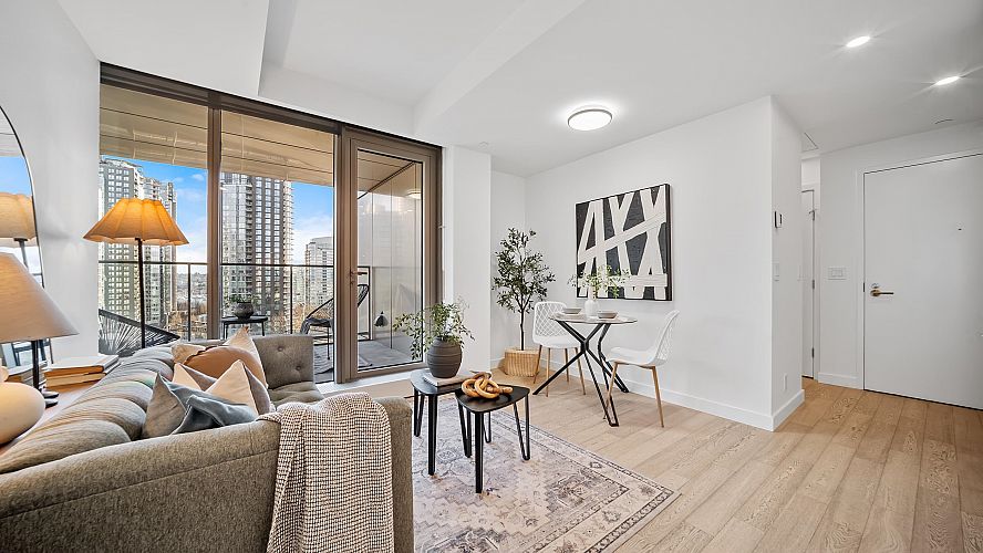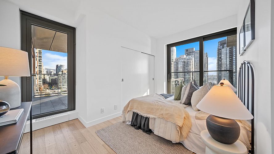A larger one-bedroom residence inside the architectural icon of Vancouver House, designed for privacy, comfort, and elevated city living. Two oversized outdoor patios frame skyline and Pacific Ocean views, creating true outdoor living rarely found in Vancouver. Triple-glazed windows deliver exceptional efficiency and near-total sound isolation, while a heat pump with multiple thermostats ensures year-round climate control. Inside, refined materials meet thoughtful design, paired with world-class amenities including a golf simulator, fitness facilities, concierge service, and a cedar-lined outdoor pool and jacuzzi. Steps from the Seawall, Granville Island, and everyday conveniences, this is quiet waterfront living at the centre of it all.