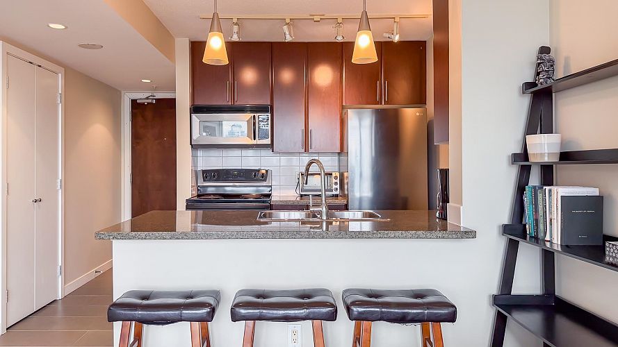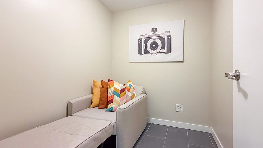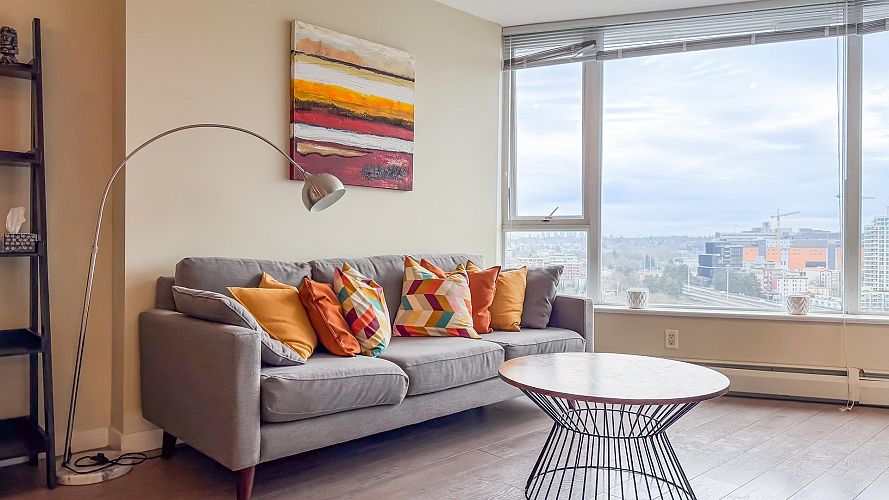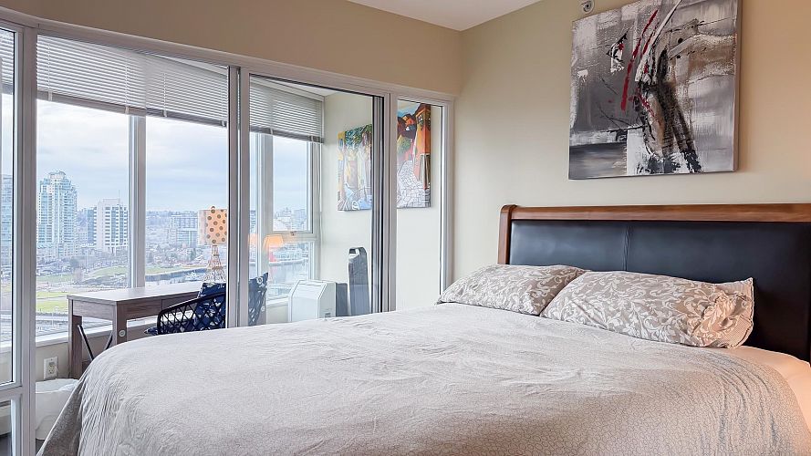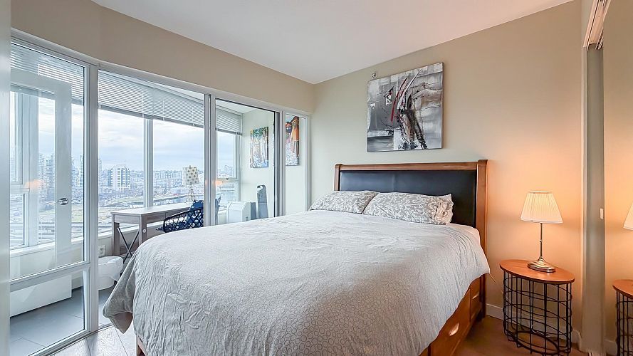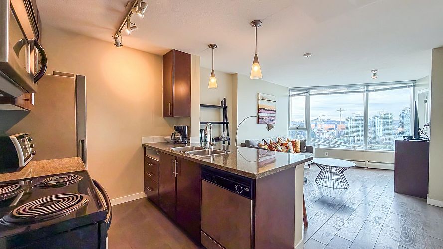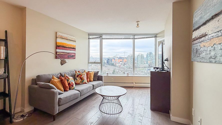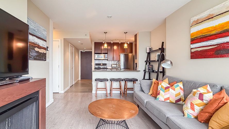 Welcome to Firenze Tower II, offering stunning northwest-facing 180° panoramic views of the city skyline, North Shore Mountains, Rogers Arena, BC Place, and False Creek. This Airbnb-friendly corner suite features 1 bedroom, 1 den, 1 bathroom, plus 1 solarium, quartz countertops, and an efficient, well-designed floor plan. Resort-style amenities include a 25-metre indoor swimming pool, hot tub, sauna, fully equipped gym, outdoor terrace, and a private theatre. An exceptional location at the crossroads of Downtown, Gastown, and Crosstown, just steps to Costco, Rogers Arena, BC Place, restaurants, and SkyTrain. One parking stall and One Bike rack included. Pets and short-term rentals (Airbnb) allowed. Open House: Sat & Sun, Feb 7 & 8, 2:00–4:00 PM.