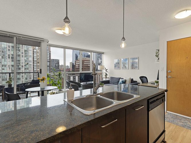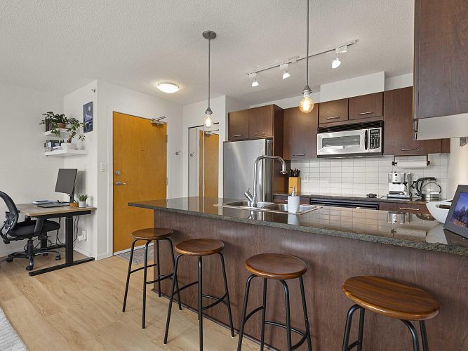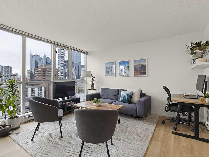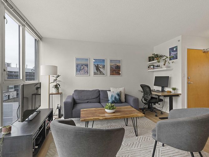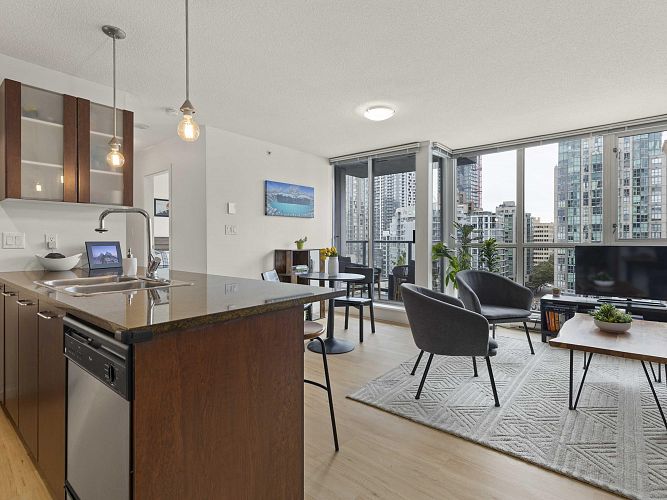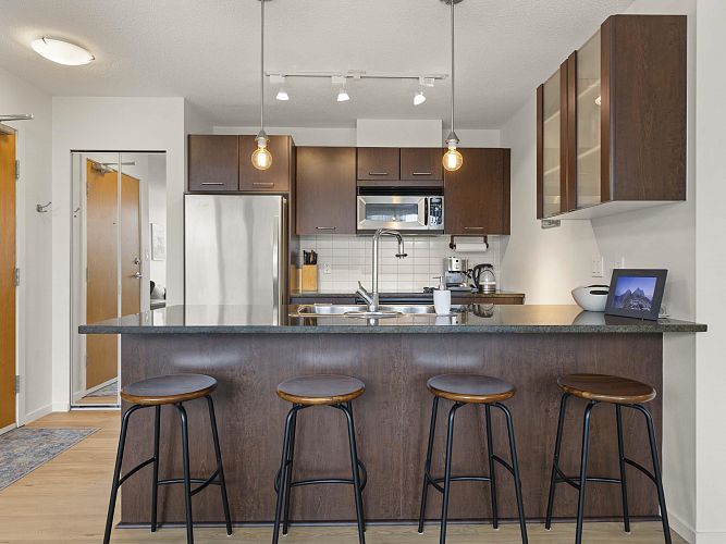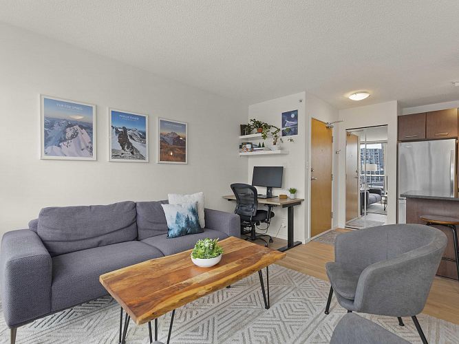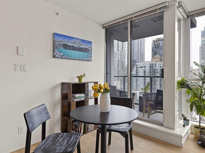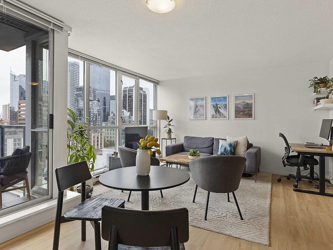 Welcome to Brava, a premier downtown residence offering the ultimate in resort-style living! This owner-occupied, upper-level corner unit boasts one of the most sought-after layouts in the building, featuring a bright and versatile one-bedroom + large den. Recently updated with sleek vinyl plank flooring, smart thermostats, a dining area, & an oversized kitchen island, it’s perfect for entertaining. Floor-to-ceiling windows flood the space with natural light and open to a private balcony with stunning city & mountain views. Enjoy the building’s exceptional amenities, including an outdoor pool & hot tub, sauna, fitness centre, guest suite, and concierge. Parking and storage included, all just steps from Yaletown, the West End, & downtown’s best dining, shopping, & nightlife! OH CANCELLED!