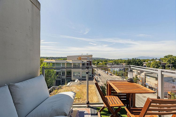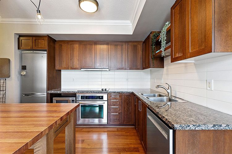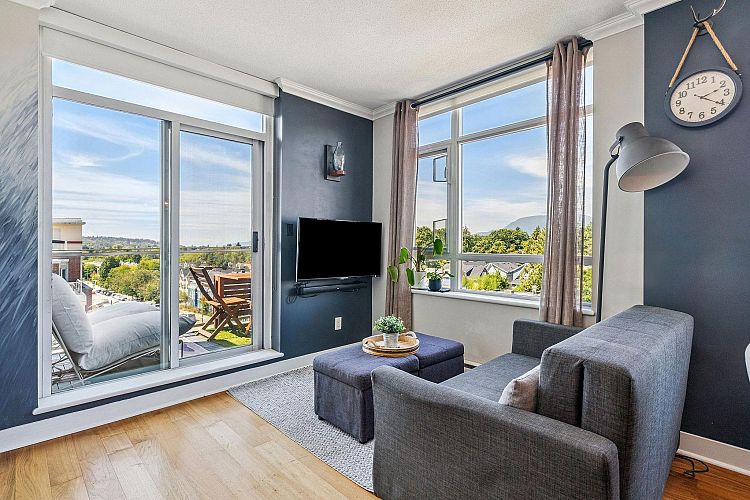 Come home to this bright 2 bedroom, 2 bathroom & den corner unit at The Vine - a solid, concrete building in one of Vancouver’s most central & walkable locations. Enjoy panoramic views of the mountains & ocean from your couch, bed or balcony. A spacious layout is finished with engineered hardwood floors. A modern kitchen features granite countertops & stainless steel appliances. While the comfortable primary includes carpet, walk-in closet & ensuite bathroom; set away from the living, 2nd bedroom & flex for a good night's sleep. Find everything you need within this well-maintained, pet & rental-friendly building. Easy, direct elevator access to IGA & London Drugs + 1 secure parking spot in the garage below. Live/invest in the Kits-Broadway corridor with the skytrain coming in 2027.