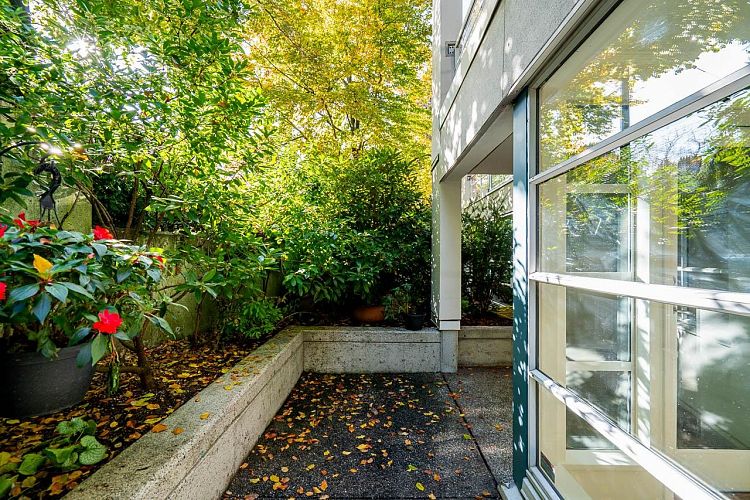 This gorgeous, ground-level 2 bedroom, 2 bathroom south-facing corner home has been tastefully updated. Enjoy a fresh coat of paint, stylish kitchen & bathroom renovations. The kitchen features Silestone quartz countertops, sleek white cabinetry, premium appliances, & breakfast bar. The bright & open living/dining area is anchored by cozy gas fireplace & flows seamlessly onto your private sunny garden patio, surrounded by lush greenery and mature trees. The primary suite impresses with ensuite boasting a walk-in shower and ample closet space. Comfort is key with radiant in-floor heating throughout the home. Located in the heart of Kitsilano, just steps to transit, parks, boutique shops, cafés, groceries, & beach. Proactive strata, fully rainscreened building, & Furry friends are welcome!