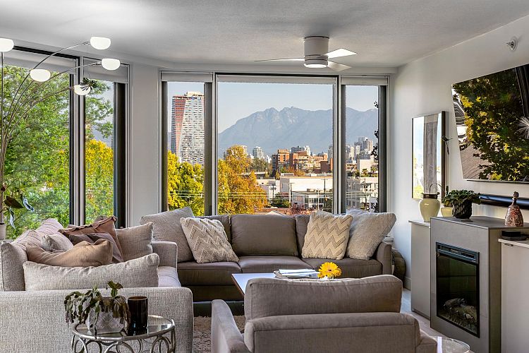 Experience unmatched quality in this fully rain-screened concrete condo with triple-glazed windows with sweeping NorthWest views of city & mountains. The custom kitchen features Silestone quartz counters, wine fridge, & GE Profile appliances. The open-concept layout includes reimagined dining area—easily convertible back to 3rd bedroom if desired—alongside Dimplex fireplace & custom millwork. Extensively renovated with over $14K in motorized blinds, fresh paint, upgraded carpets, baseboards, trim, LED lighting, & high-efficiency heaters. Luxurious touches include NuHeat heated floors, dimmable LED mirrors, & premium UK fixtures. Includes 2 side-by-side parking, storage, & access to saltwater pool, hot tub, & sauna. EV-ready building with proactive strata & $16M envelope renewal completed.