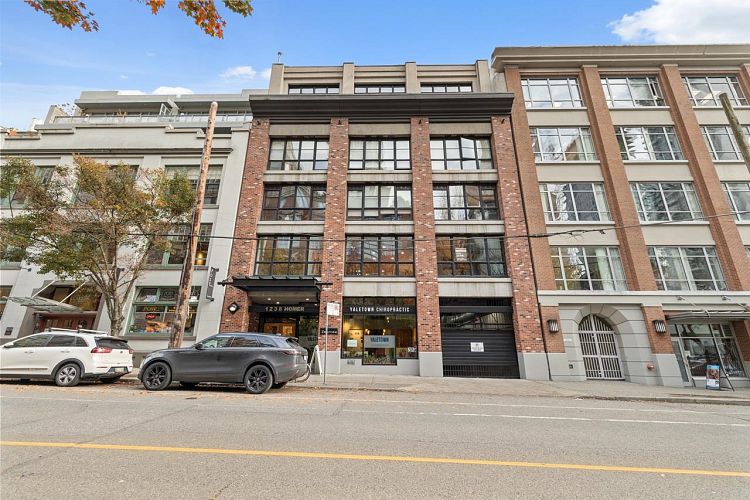 This gorgeous 2 bed renovated suite in The Grafton showcases the best features of this historic warehouse conversion. Updated with wide plank European white oak floors that complement the beautiful wood beams and brick walls. The 2014 reno also included new interior windows, recessed lighting, ceiling fans, paint, closet organizers and built-in shelving. A larger bathtub was added with new tiled surround, the kitchen bar was lowered for more counter space, new sink and faucet, new Corian counters and updated appliances, new gas fireplace w/ modern surround and recessed TV with heat protection. New W/D (2023), 1 pkg and 1 locker. Located in the heart of Yaletown just steps from trendy boutiques, restaurants and 2 blocks to the Canada Line station. Easy to show! Open House Sat 1-3pm.