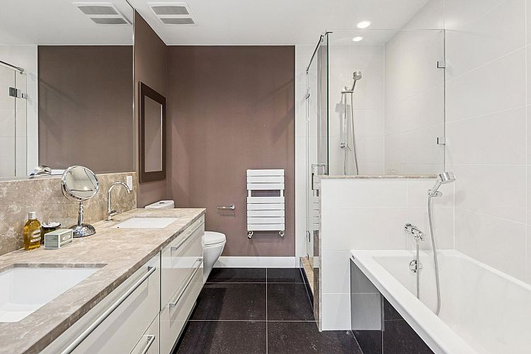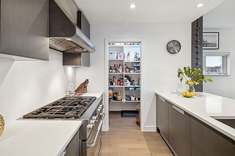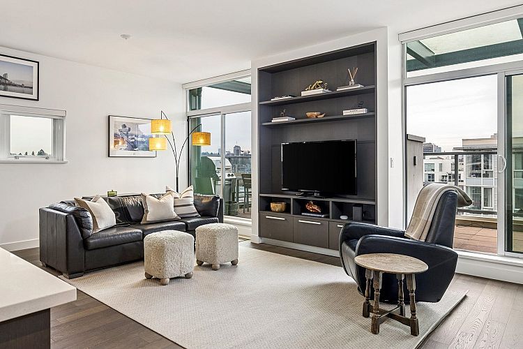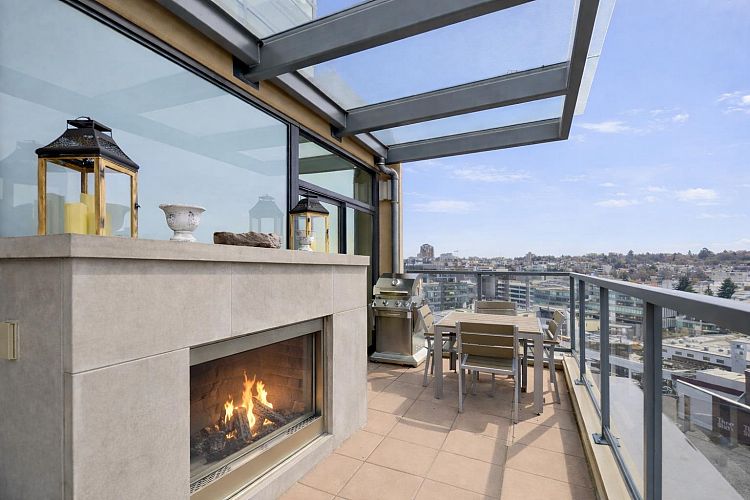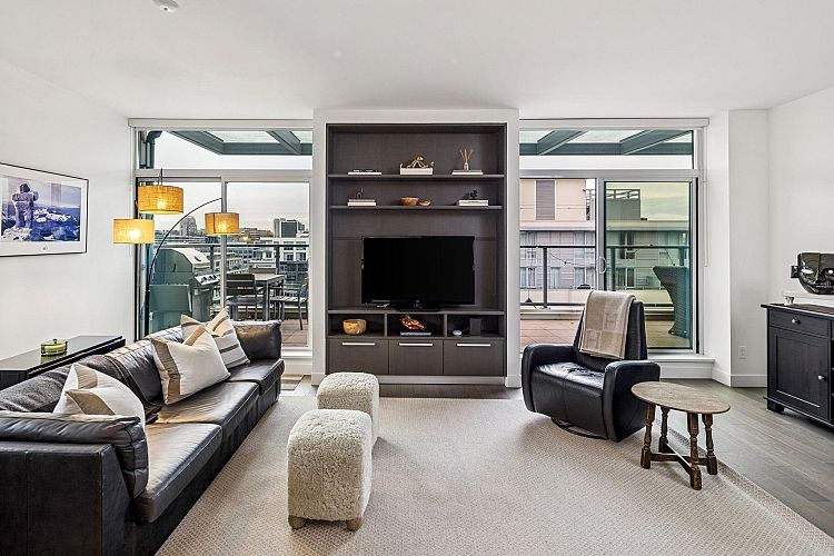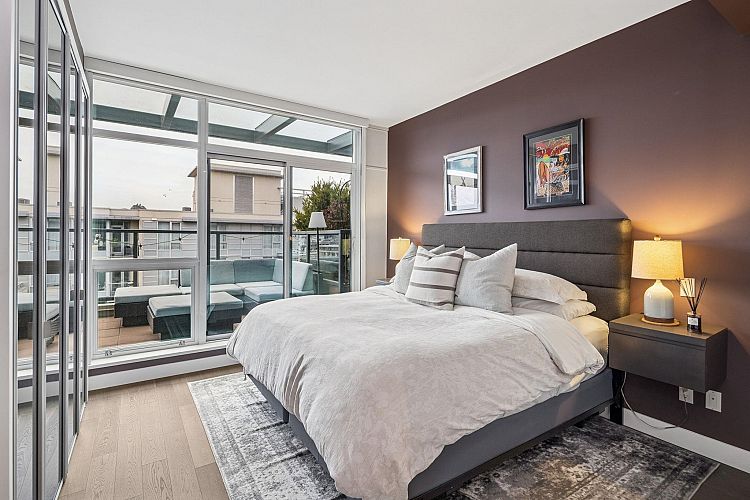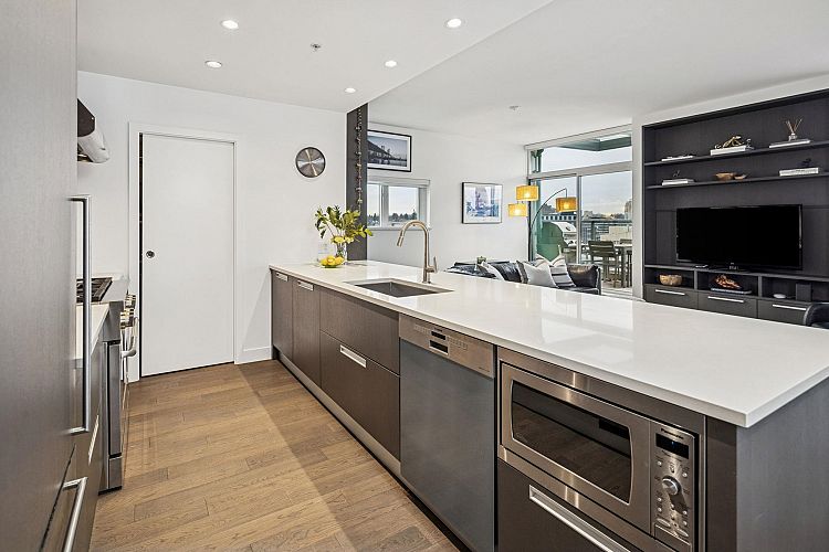 Luxurious 2 BED, 2 BATH + DEN w/ WATER VIEWS at 'The James' by Cressey offers 1,271 sqft of thoughtfully designed, expansive interior living. Feat. incl, sleek hardwood flooring, high-end S/S & Miele appliances, A/C, radiant in-floor heating, 2 integrated beverage fridges, custom millwork, extensive in-suite storage & primary walk-in closet, & a dedicated pantry. Floor-to-ceiling windows provide western exposure with open views of Downtown, False Creek, and Mount Pleasant. A massive private terrace w/ a gas fireplace creates an exceptional extension of the living space, ideal for entertaining. Incl. 2 side by side parking stalls w/ EV capability, concierge, gym & rooftop terrace & lounge w/ BBQ area. Impeccably maintained, steps to the seawall & endless restaurants + cafes. A true gem.