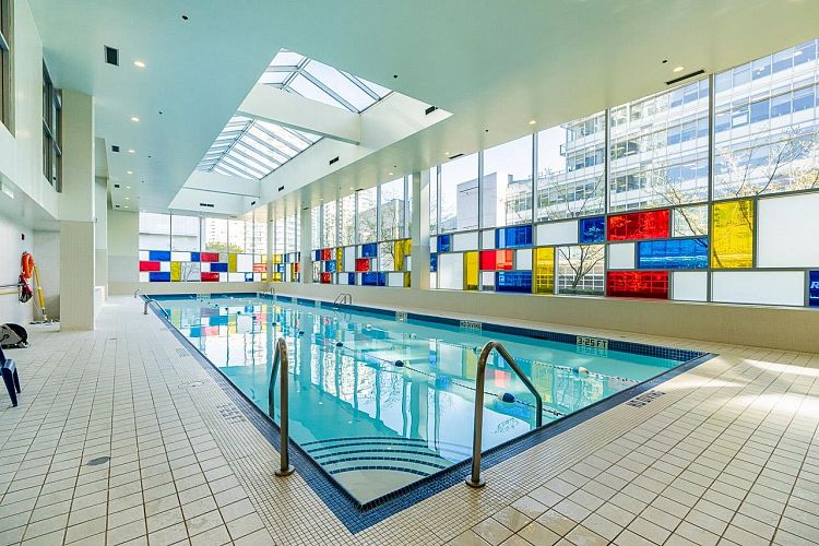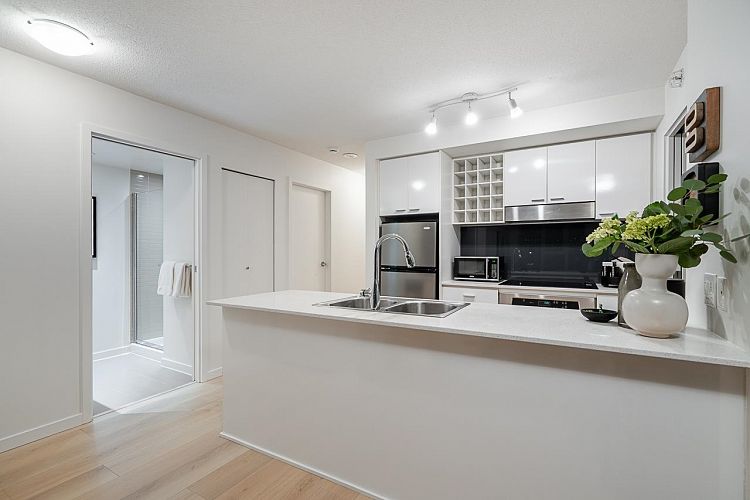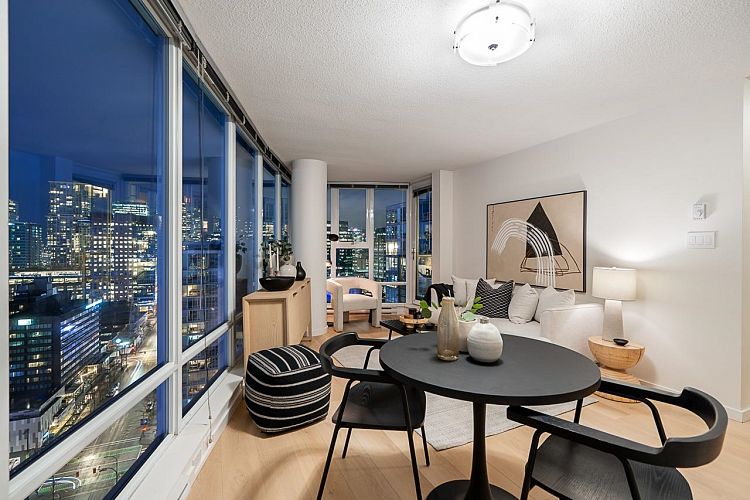 Welcome to this stunning SW-facing 2 bed, 2 bath & den home at Spectrum 1, refreshed with wide-plank flooring and beautiful paint tone- it is a gorgeous unit! This 893 sq.ft residence features floor-to-ceiling windows with expansive city views from all main living areas. The well-designed layout separates the primary bedroom with ensuite from the second bedroom for added privacy. An open-concept kitchen, living, and dining area is ideal for entertaining. Highlights include a generous in-suite storage/flex space and solarium perfect for a home office, a BBQ-friendly patio, & parking stall. Enjoy resort-style amenities including a pool, fitness centre, party room, outdoor terrace, bike room, and 24-hour concierge. Steps to dining, transit, Costco, the seawall and downtown entertainment.