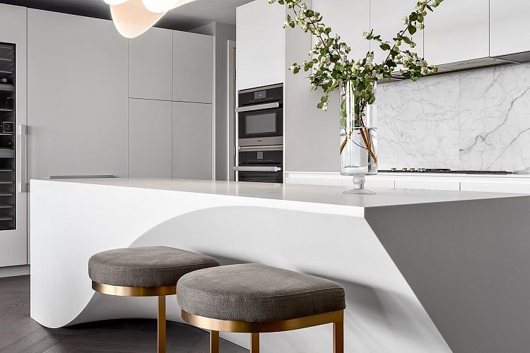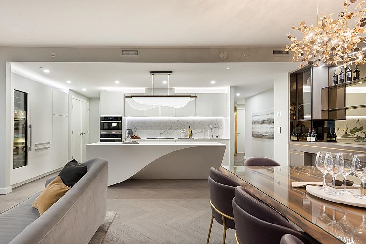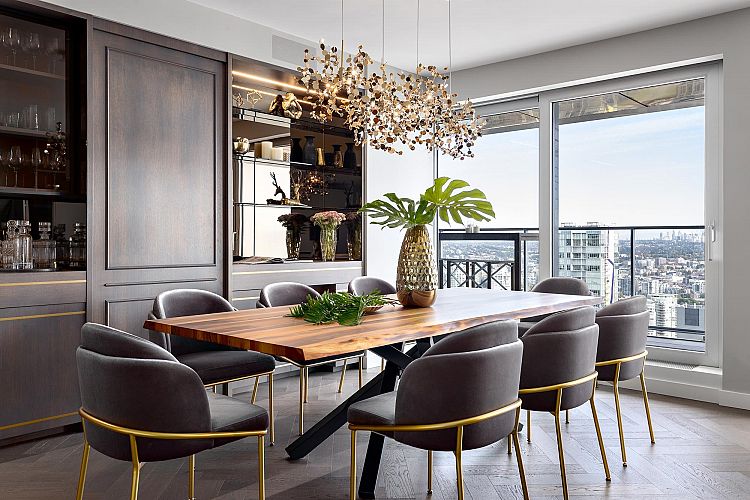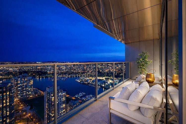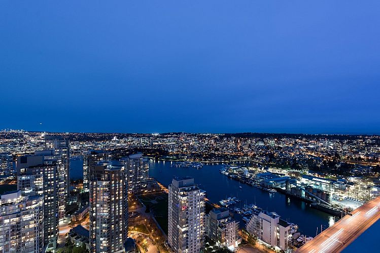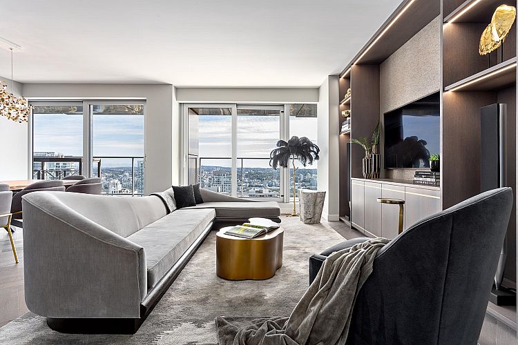 GEORGIE AWARD FINALIST! An extraordinary estate in the sky, this stunning residence showcases a spectacular renovation with bespoke millwork and elevated design throughout. Herringbone hardwood floors lead to a dramatic entertaining space designed by Kalu Interiors & built by Tall Tree Construction. Brass-inlaid walnut cabinetry with LED lighting and floating glass shelves is set against a smoked glass backdrop, creating warmth and sophistication. A discreet secret door separates the private primary suite. Featuring a sleek Boffi kitchen and 3 spa-inspired bathrooms wrapped in Carrara marble. Offers 2 bedrooms & a large den (easily a 3rd bedroom). Two covered terraces capture breathtaking False Creek views, extending the living space to approx. 1,820 sq ft combined living OPEN Sunday 2-4