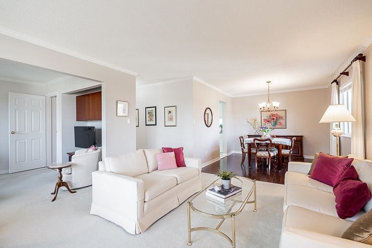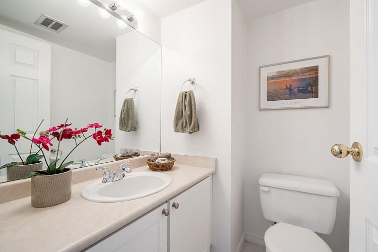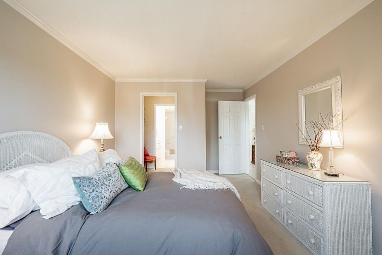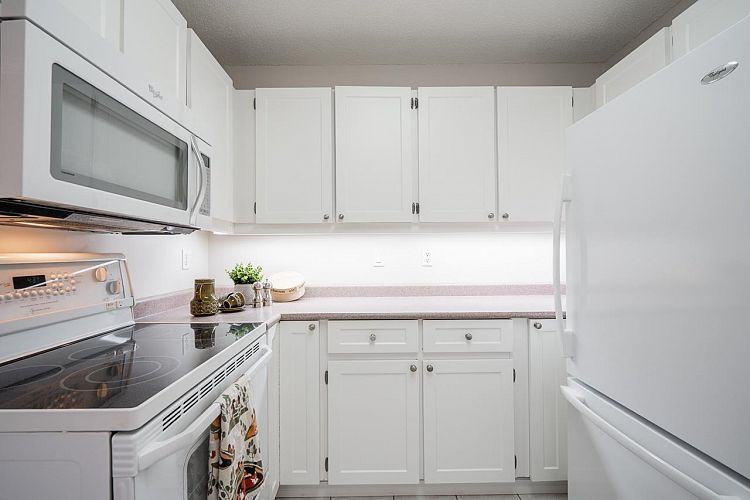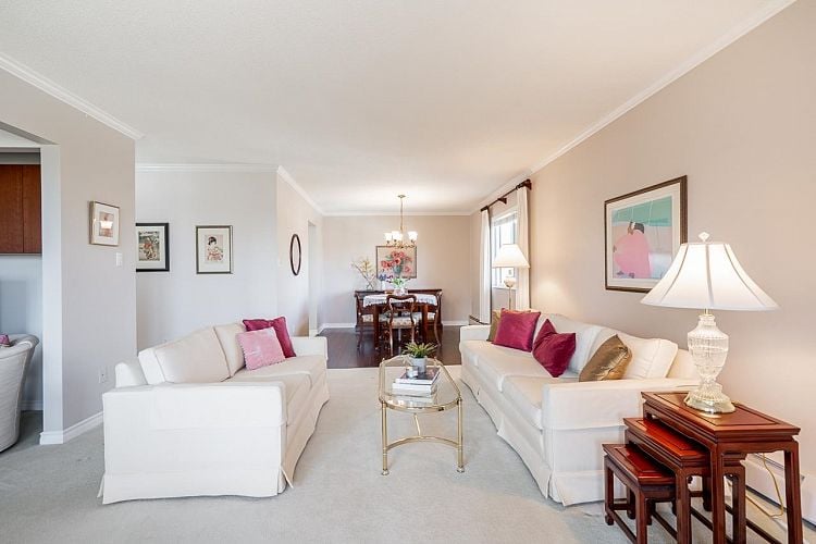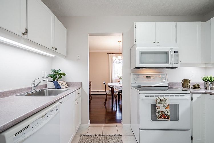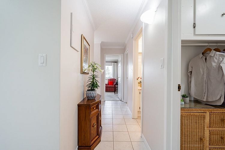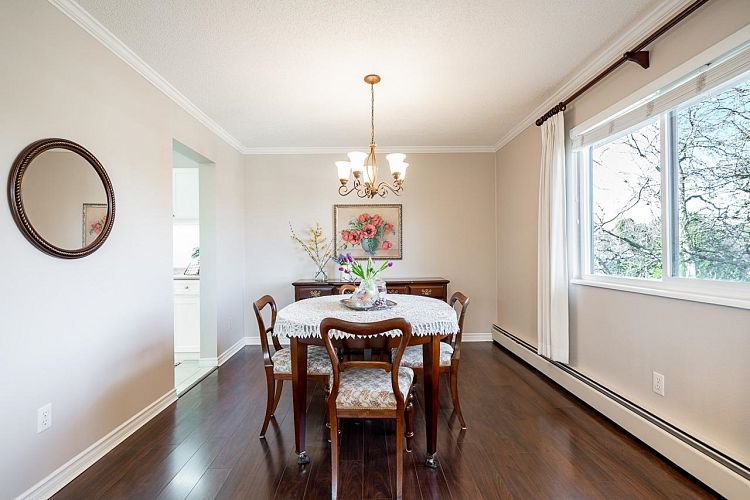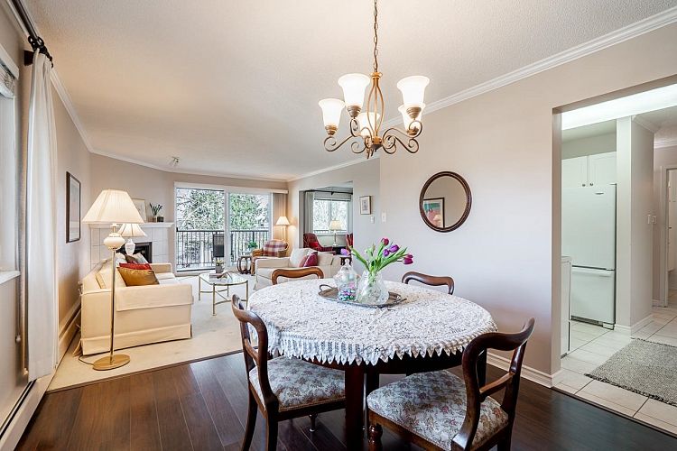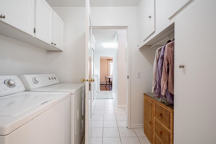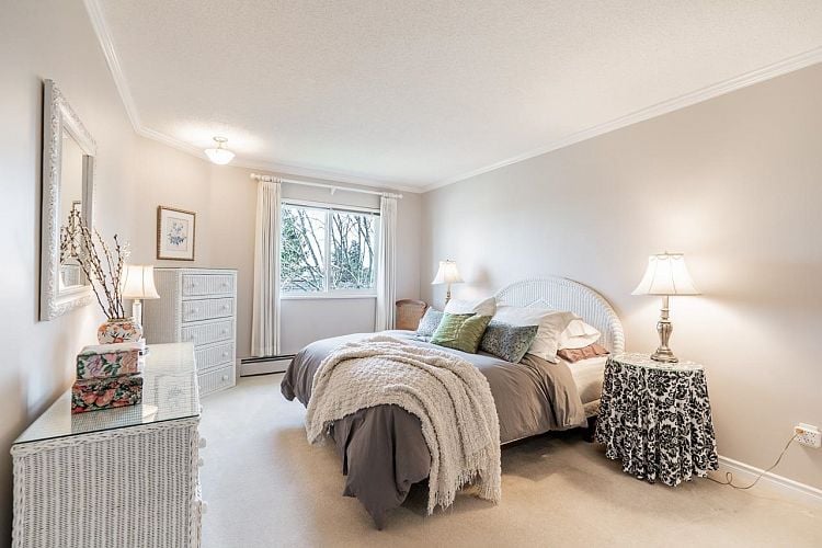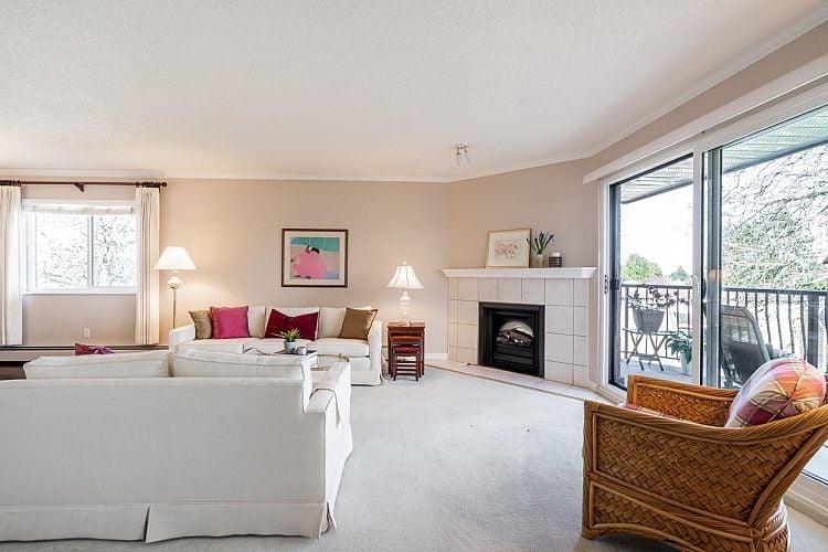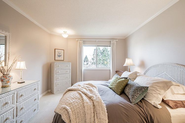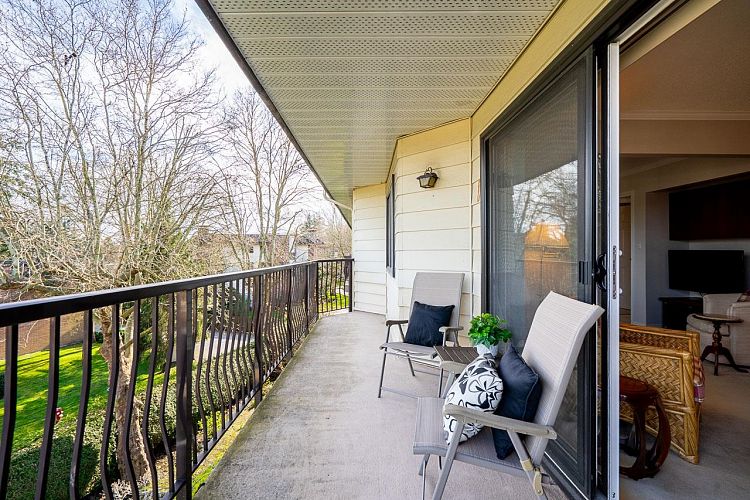 This cheerful, elegant, and sensible top-floor 2-bedroom home is surrounded by greenery in the heart of Richmond! Bright and refreshed with subtle upgrades, this 1,065 sq ft unit features a spacious & fluid layout, generous rooms, and a large living/dining area -- perfect for relaxing and entertaining. Enjoy abundant natural light, southern exposure, Mt. Baker views, and a calming treed outlook from the 125 sq.ft year-round covered balcony. You will appreciate its “Bells, no whistles” simplicity with a neutral palette for your furnishings. Includes insuite laundry room, parking, and a storage locker conveniently located on the same floor. Close to shopping, dining, parks, transit … and summer swimming! Best value on the market! Now, it’s your move!