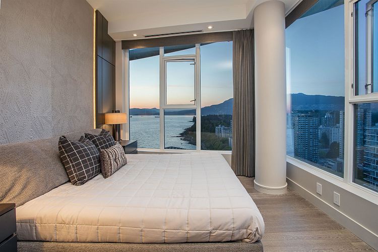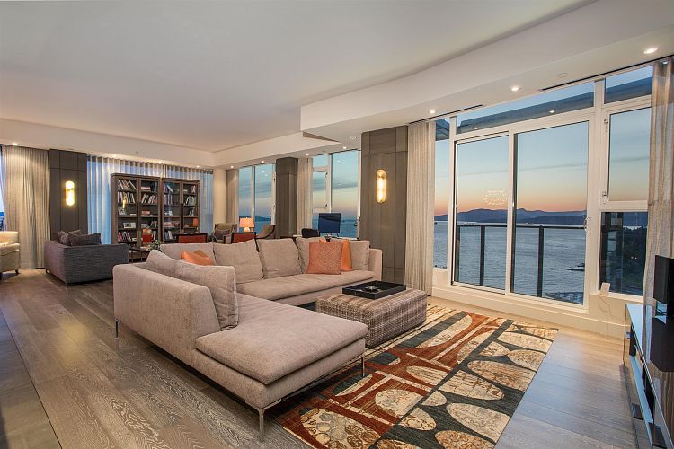 The English Bay Penthouse! Full-floor-2,850 sf PH with 1,500 sf of outdoor space w/ private elevator access and breathtaking all day & night views. Redesigned by Fay Mihailides Design in 2020, it features an 18-ft Wow Fusion kitchen island, Siena tile floors w/ bronze inlay, rift-cut oak wall panels, Rocky Mountain brass hardware, Moooi padded feature walls and custom alabaster lighting. Private primary retreat includes a spa-like ensuite and secluded patio w/ water & mtn views. Two additional ensuite bedrooms also boast private patios and mountain vistas. Two large terraces with multiple lounge zones,lush irrigated gardens & a full outdoor kitchen with Heston BBQ. Rare private 5-car garage outfitted w/ epoxy flooring & smart storage solutions. A true gem! Your only mission is to get home!