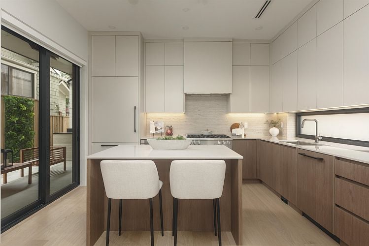 Proudly crafted by Medallion Homes and designed by VictorEric- Georgie Award winning, this south-facing Kitsilano front-unit duplex delivers refined coastal luxury just steps from Kits Beach, parks, cafés, and top Westside schools. Featuring 3 beds and 3.5 baths, it offers thoughtful design and premium finishes throughout. The gourmet kitchen includes Miele and Fulgor Milano appliances, custom cabinetry, and a sleek layout perfect for daily living and entertaining. Enjoy multiple walk-out patios, including a private chic Westcoast cedar patio with built-in BBQ, heaters, and a custom green wall. The top-floor bedroom is a serene retreat with a private deck and spa-inspired ensuite. Full crawlspace storage and a detached garage with epoxy flooring complete this exceptional home.