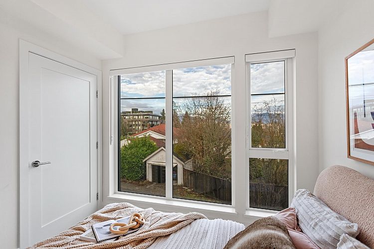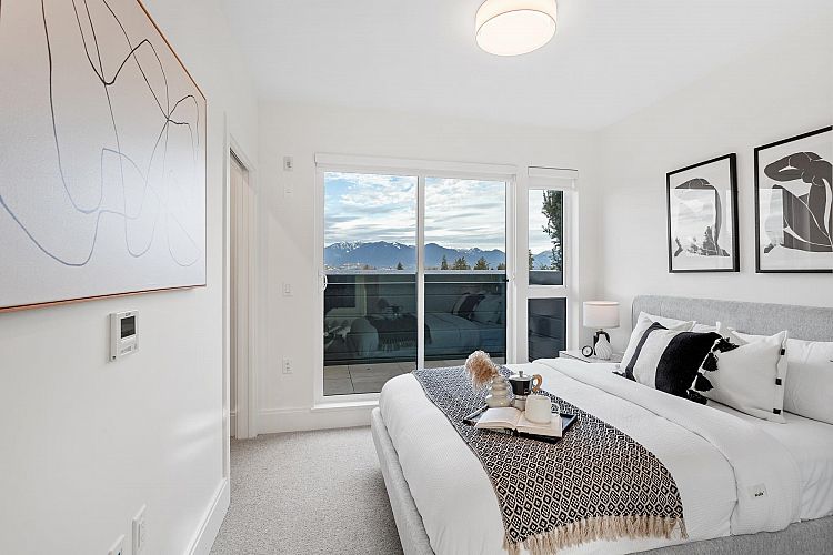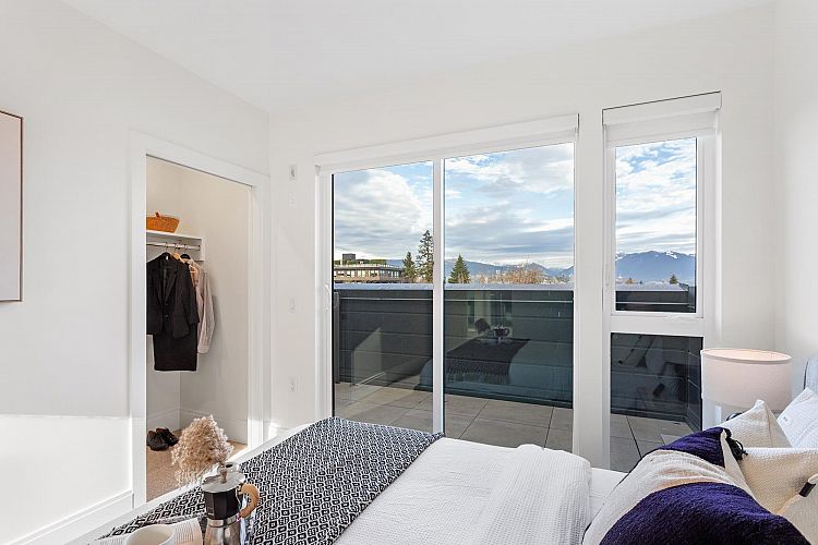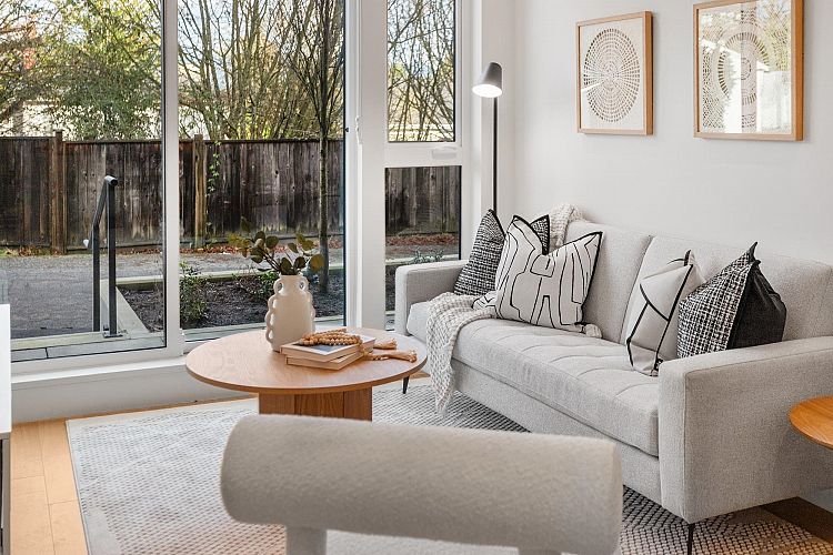 MOVE IN READY | Discover this beautiful 3-bedroom & den + flex home at Seasons by Sighline, offering modern living with an open-concept design on a quiet tree lined street. The bright living area flows into a gourmet kitchen with Miele appliances, sleek cabinetry, and an oversized island. The primary suite features an en-suite bath, walk-in closet, and private patio with gorgeous downtown views. Two additional bedrooms, den, and a versatile lower-level flex space provide ample livable space. Enjoy the private patio and landscaped surrounding. Includes A/C, custom built in cabinetry, built in speakers, EV-parking and direct access to the parkade. Prime location near shopping, Skytrain, dining, and schools. Schedule your showing today!