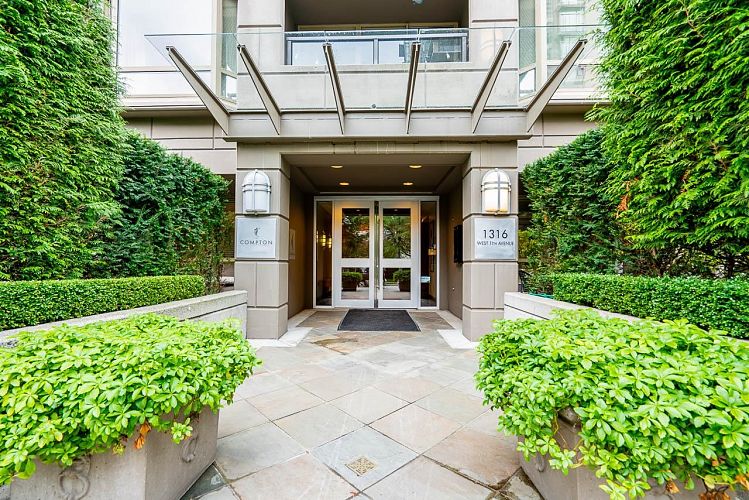 Luxury corner sub-penthouse with beautiful ocean, mountain, and city views at the posh “Compton”, a high-quality, concrete Polygon building located on a quiet tree-lined street in the highly-desirable South Granville area. Great layout includes 2 spacious bedrooms (primary bedroom accommodates king bed), 2 bathrooms + den + flex room, open-concept floorplan with gas fireplace. Bright kitchen features s/s appliances and granite counters. Situated just blocks to cafes, shops, theatre, and restaurants on Granville Street, and easy stroll to Granville Island and seawall. Nearby bus stops and coming-soon subway station. 1 parking (potential EV chrg). Pets: 1 dog or 2 cats allowed. Perfect for those seeking a very elegant home in a lovely walkable neighbourhood.
